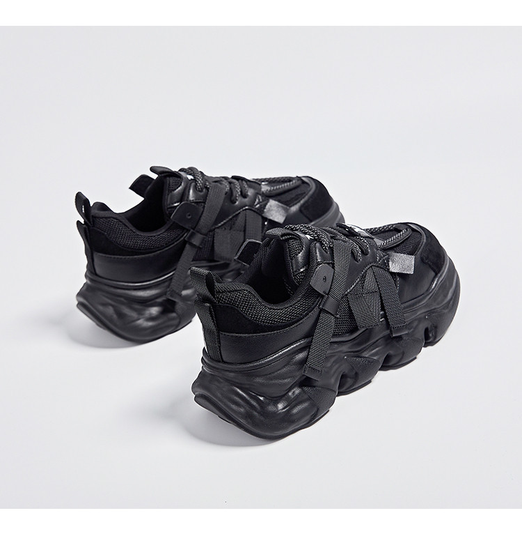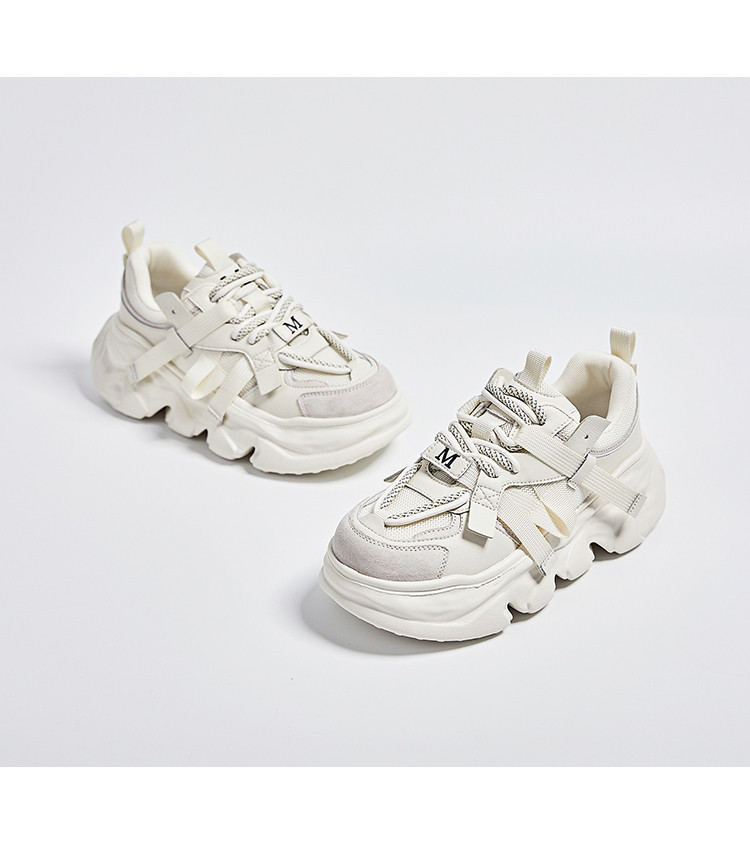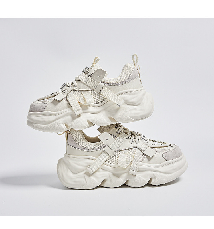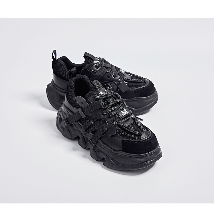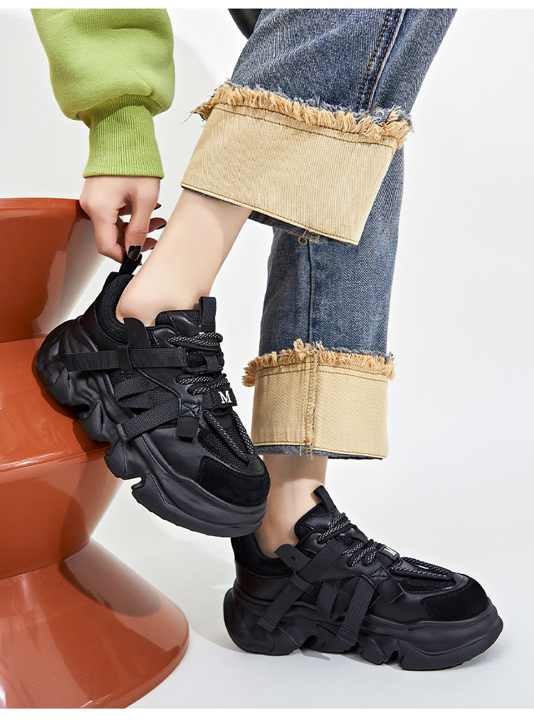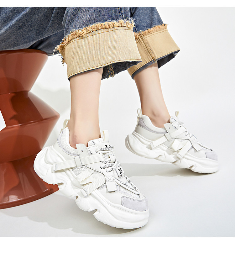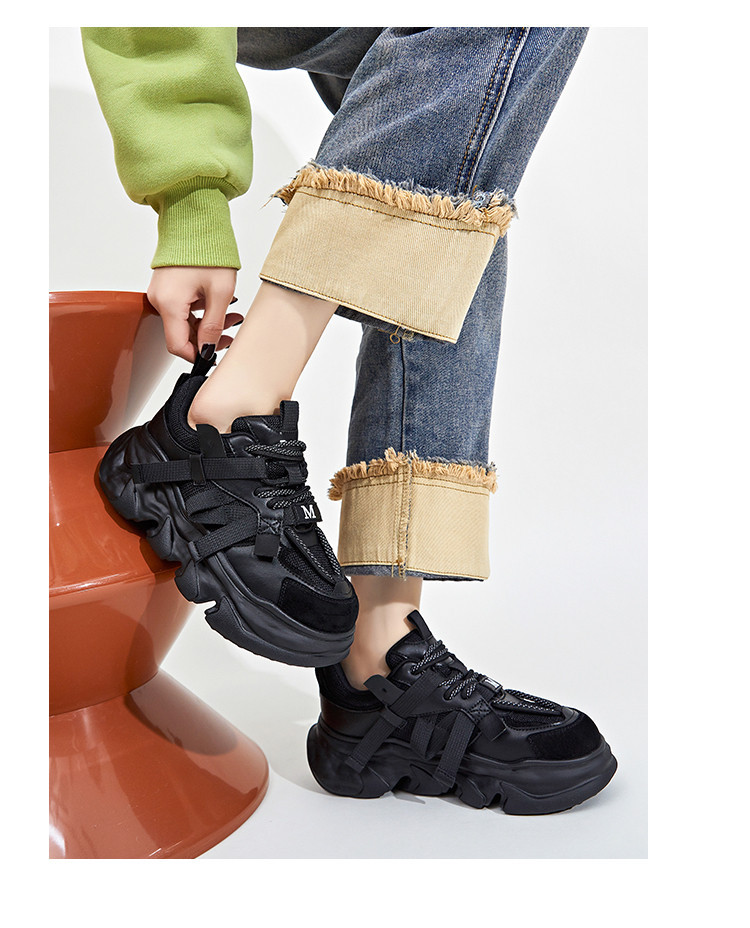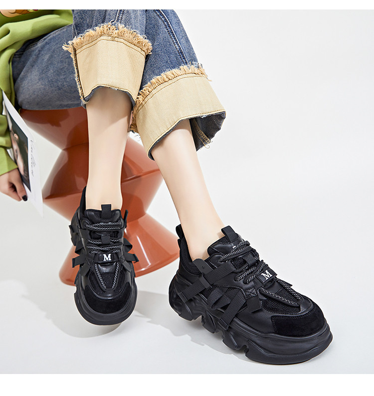 Luxury Leather Dad Shoes for Women Spring New Round Head Pure Color Lace Up Sports Shoes Thick Bottom Increase Height Fashion Running Shoes